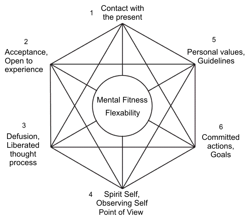 The central figure and map in ACT is the Hexagon. It shows the six basic skills or processes that comprise how we function in life. This figure is usually called the Flexagon as the ultimate purpose and product of learning and using these skills are to obtain a Flexible Mind.